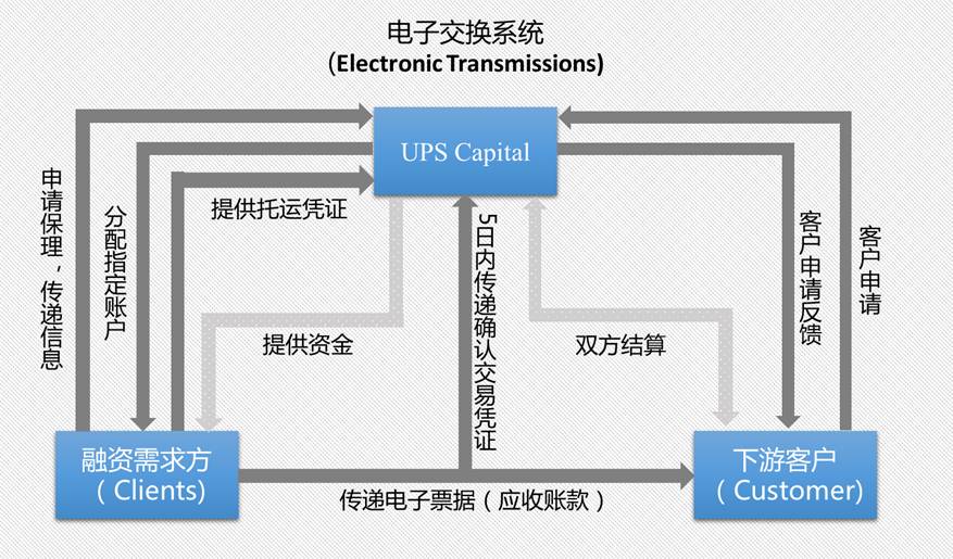 不同于货物金融业务,运行管理的基础是全球贸易过程中的货物,应收账款管理解决方案针对的是贸易过程中的应收账款。其运行方式是:融资需求方及其下游客户必须认同、加入UPS Capital制定的电子交换系统。利用该系统的融资需求方承担的责任有:接受和传递各类文件数据,提交制定客户作为收款方的保理申请,向UPS Capital提供票据和信用信息,传递票据给下游客户以及其他各种所需信息的沟通。UPS Capital可以运用该系统实施:审批保理,认可或拒绝融资需求方下游客户的申请,审核确定客户的信用级别,监控交易的过程以及处理相关的融资业务等。在这种融资模式中,平台提供商、综合风险管理者以及流动性提供者都是UPS Capital,资金流产生的基础是买卖双方行程的交易以及伴随而生的应收账款、应付账款。